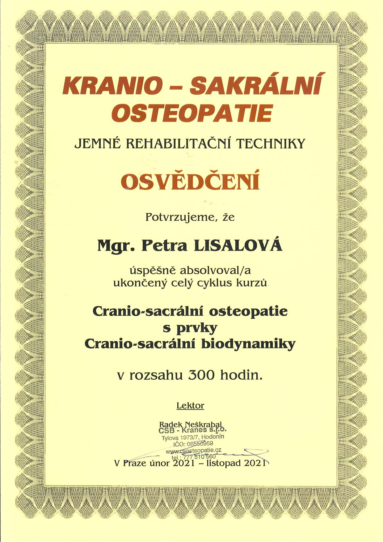 Certifikát o absolvování certifikovaného cyklusu kurzů Cranio-sacrální osteopatie s prvky Cranio-sacrální biodynamiky.